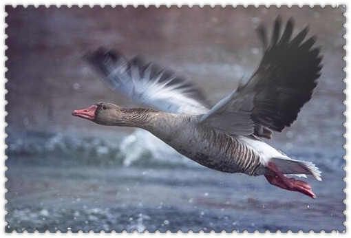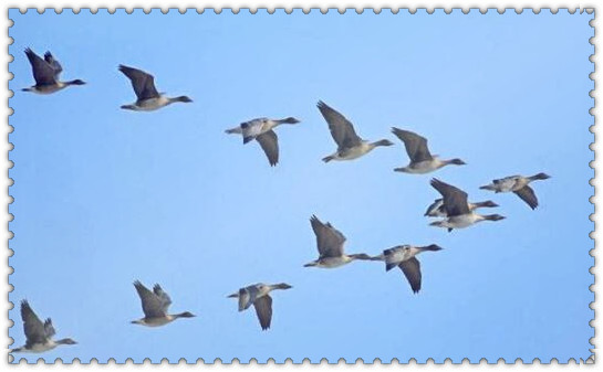 当飞在前面的“头雁“的翅膀在空中划过时,翅膀尖上就会产生一股微弱的上升气流,排在它后面的就可以依次利用这股气流,从而节省了体力。但“头雁”因为没有这股微弱的上升气流可资利用,很容易疲劳,所以在长途迁徙的过程中,雁群需要经常地变换队形,更换“头雁”。它们的行动很有规律,有时边飞边鸣,不停地发出“伊啊,伊啊”的叫声。迁徙大多在黄昏或夜晚进行,旅行的途中还要经常选择湖泊等较大的水域进行休息,寻觅鱼、虾和水草等食物。每一次迁徙都要经过大约1~2个月的时间,途中历尽千辛万苦。但它们春天北去,秋天南往,从不失信。不管在何处繁殖,何处过冬,总是非常准时地南来北往。
