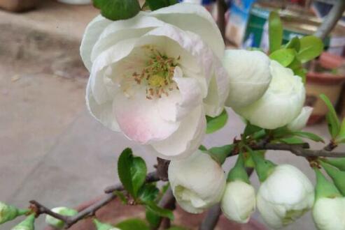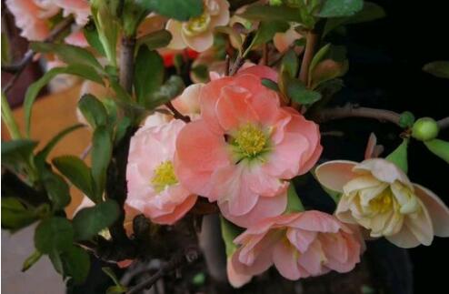 又名倭海棠,日本木瓜。其花与贴梗海棠极相似,只是叶稍薄。其干多丛生,多分枝,枝上有疣状物突起,枝上有细刺。花色有大红和粉红色,每簇花由数朵组成,紧贴在枝上,艳丽妩媚。盛开时繁花似锦,极为美观,是春节观赏的佳品。
