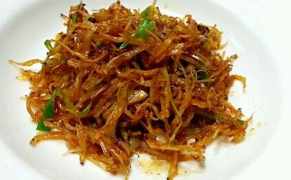 5.开炒:放油,油热后先煸炒胡萝卜丝,放一点点盐和鸡精。大约半分钟后,放入银鱼蛋液。炒到鸡蛋变色就可以起锅了。