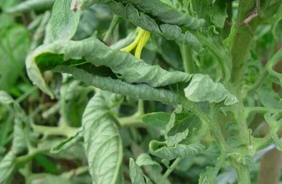 三、花期使用2,4-D蘸花时,浓度过大或洒在叶片上,使叶片变厚、皱缩或向下卷缩。另外,春季在大田里栽培,周围麦田喷洒2,4-D丁酯防除麦田杂草,药液飘浮也易造成药害,导致叶片畸形上卷。