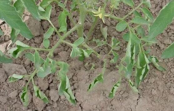 三、氮肥施用量过多,导致土壤溶液浓度升高,会引起西红柿小叶翻转、上卷;盐碱地区土壤溶液浓度高,也会出现叶片向上卷曲的现象。