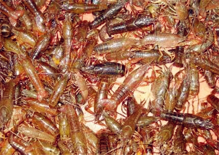 3月下旬至4月上旬,使用良种塘口的越冬苗,每亩投放小龙虾苗种4000尾。放苗前布置好池塘内的水草或竹叶菜,占池塘总面积的50%左右。开春时用新鲜碎小杂鱼与虾用颗粒饲料轮换投喂,每天每亩投喂1.5公斤干料(鲜碎鱼粒3公斤),并逐步增加饲料投喂量,每5天每亩增加0.5公斤,至放苗1个月时,每天每亩投喂5公斤,放苗后45天下网检查,当小龙虾达到34~36尾/公斤时即可回捕。