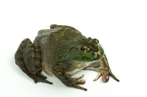 2、牛蛙:牛蛙头部宽扁,口端位,吻端尖圆面钝,眼球外突,背部略粗糙,有细微的肤棱,四肢粗壮,前肢短,无蹼,后肢较长大,趾间有蹼,肤色随着生活环境而多变,通常背部及四肢为绿褐色,背部带有暗褐色斑纹,头部及口缘鲜绿色,腹面白色,咽喉下面的颜色随雌雄而异,雌性多为白色、灰色或暗灰色,雄性为金黄色,鸣声很大。