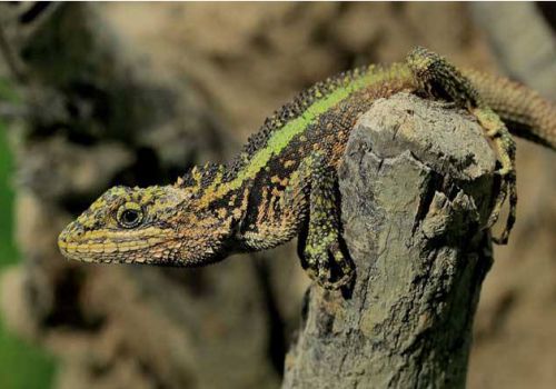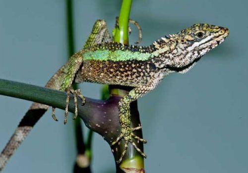 丽纹龙蜥体型较小,在60×40×40厘米的标准爬箱内可饲养的最大容量1~6条,爬箱需要足够的通风。箱内放置些沉木或藤条供其攀爬并点缀些仿生植物,观赏效果会很好。