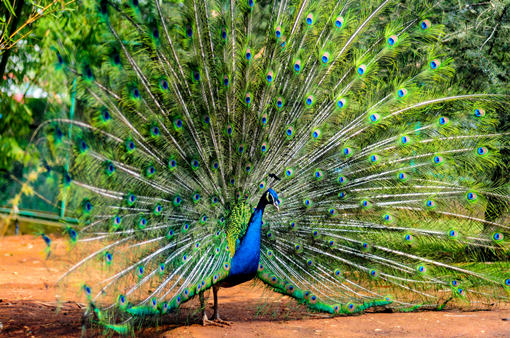 在孔雀的大尾屏上可以看到五色金翠线纹,其中散布着许多近似圆形的眼状斑,这种斑纹从内至外是由紫、蓝、褐、黄和红等颜色组成的,一旦遇到敌人而又来不及逃避时,孔雀便突然开屏然后抖动它沙沙作响,很多的眼状斑随之乱动起来,敌人畏惧于这种多眼怪兽也就不贸然前进了。