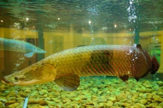 巨骨舌鱼是体型比较大的淡水鱼之一,它的舌头上有硬骨牙齿,所以被称为骨舌鱼,也被人们叫做海象鱼。是从远古时代生存到现代的鱼类,专家推测这种鱼类有可能出现在一亿年前,现在野生的主要分布在亚马逊河流域,这种鱼的鱼肉很美味,而且没有什么鱼刺,被人们密集捕捞,现在野生活鱼的总数可能还不到十万。
