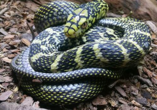菜花蛇,还有一个比较专业的名字——黑眉锦蛇,其体型比较庞大,具有攻击性,但是却是无毒蛇种,喜欢攀爬,一般生活在丘陵、草丛、平原以及村舍附近,以鼠为食,属国家保护的有益的、有重要经济价值、有科学研究价值的陆生野生动物。