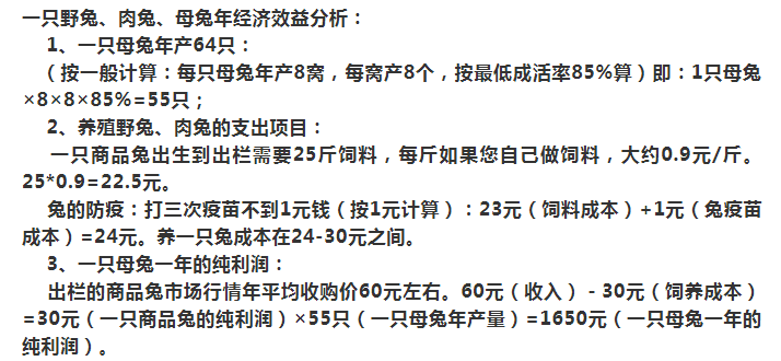 出栏的商品兔市场行情年平均收购价60元左右。60元(收入)-30元(饲养成本)=30元(一只商品兔的纯利润)×55只(一只母兔年产量)=1650元(一只母兔一年的纯利润)
