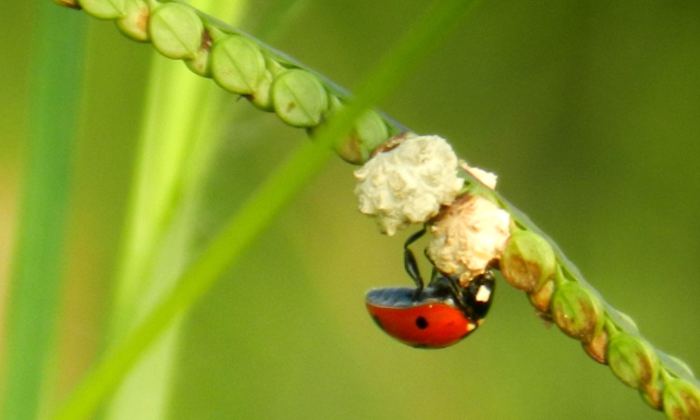 七星瓢虫本种分布非常普遍,但是七星瓢虫还是有机农业的象征哦!较少成群群聚。但是户外蚜虫堆里面会经常看见来找食物的成虫。以成虫过冬,次年4月出蛰。成虫和幼虫均以多种蚜虫、木虱等为食。系益虫,应予保护。