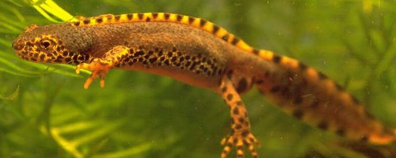 蝾螈的外部形态,它由头、颈、躯干、四肢和尾5部分组成。成体全长6-8厘米。皮肤裸露,背部黑色或灰黑色,皮肤上分布着稍微突起的痣粒,腹部有不规则的桔红色斑块。蝾螈的颈部不明显,躯干较扁,四肢较发达,前肢四指,后肢五趾,指(趾)间无蹼,尾侧扁而长。蝾螈在水底和陆上用四肢爬行,在水中借躯干和尾能上能下不断弯曲摆动而游泳。