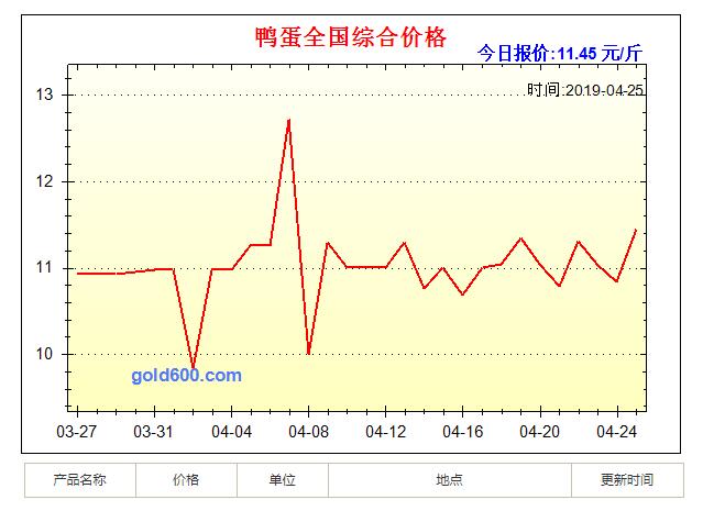 2019年11月24日全国鸭蛋收购价格下跌。今日最高价格6.4元,最低价格5.0元,今日鸭蛋价格行情汇总(价格仅供参考,不作为投资和交易依据)