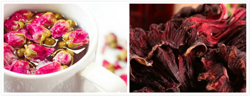 1.玫瑰花茶+洛神花茶=美容养颜、活血调经、淡化色斑、减肥瘦身