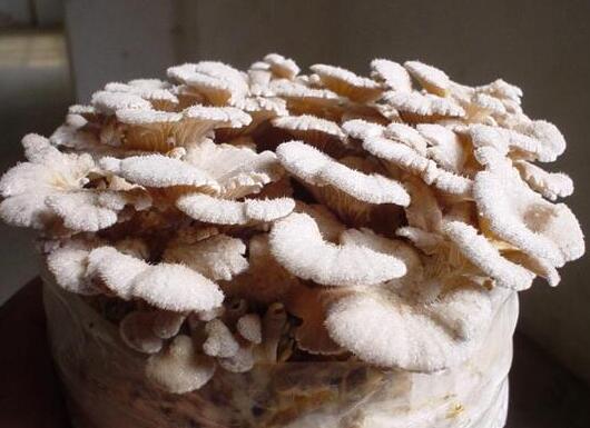 七、采收加工。白参菌在适宜的环境条件下,从接种至采收需16-20天,当子实体叶片平展时即可采收。采时用利刀从基部切下,并修净基部杂质。采收前停止喷水,避免脆断损坏朵形。一般第1潮菇收后停止喷水2天,生息养菌,然后照常管理;7天后又产出第2潮菇。管理得当一般可长2-3潮菇,生物转化率40-50%。长袋的单产200-250克,短袋的单产100-150克。鲜品用塑料泡沫盒和保鲜膜包装送往超市,在4-5℃低温下货架期12-14天;加工干制时,可用机械脱水烘干,鲜干品比例为4:1,干品用双层塑料袋密封包装防潮。