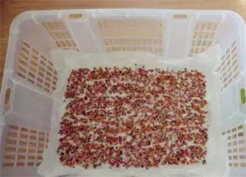 果筐或者脸盆里面铺的纸用喷瓶喷湿透,再将泡好的种子均匀的平铺在上面。把铺好的种子上再喷一层水。用一块湿毛巾覆盖在筐上,起保湿作用。