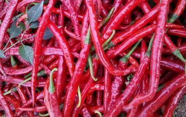 辣椒,别名:牛角椒、长辣椒、菜椒、灯笼椒,属一年或有限多年生草本植物。茎近无毛或微生柔毛,分枝稍之字形折曲。叶互生,枝顶端节不伸长而成双生或簇生状,矩圆状卵形、卵形或卵状披针形,全缘,顶端短渐尖或急尖,基部狭楔形;花单生,俯垂;花萼杯状,不显著5齿;花冠白色,裂片卵形;花药灰紫色。果梗较粗壮,俯垂;果实长指状,顶端渐尖且常弯曲,未成熟时绿色,成熟后成红色、橙色或紫红色,味辣。种子扁肾形,淡黄色。