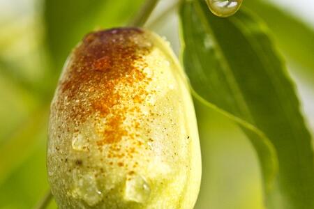 2、枣头摘心花期枣头摘心,抑制枣头旺长,可促进坐果。