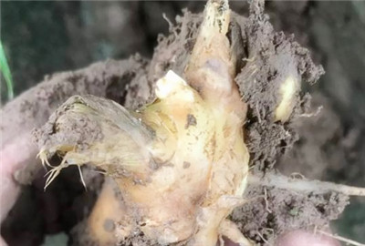 姜温病一般发生在7月下旬至9月上中旬,该病主要为害生姜茎叶和根茎,地上茎部被害呈暗紫色,内部组织变褐腐烂,只残留纤维。