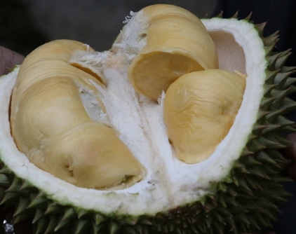 (4)谷夜套:肉特别细腻,其甜如蜜,核尖小为“食家”所欢迎,为价最高的一种榴莲。泰国榴莲的产地广阔,从中部暖武里府至动部罗勇府,巴真武里府的榴莲曾获得冠军。泰国南部榴莲较中部和东部的逊色,核大肉小,但因成熟较迟,在其它榴莲盛季过后,便以“物稀为贵”。