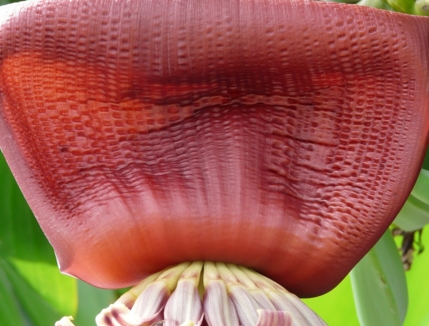 花芽分化期的开始,表面树体转入生殖生长。此时香蕉树体需要消耗大量的养分,此时必须及时增施肥料,以促进分化,形成较多的梳数和果数。花芽分化还受气温的影响,以致梳数、果数、果形在不同季节表现不同。在珠江三角洲地区被称青皮仔、白油身、尖嘴等。花芽分化完成后,气生茎不断往上长,叶片着生的位置也呈水涨船高之势,最后在顶端抽出“葵叶”,接着现蕾。花蕾抽出后弯下打开花苞开花,花序为穗状无限花序。每梳花由船底形的花苞包住,苞形有长披针形和阔卵形两类,先端有锐尖和钝尖两类,苞色有紫红、橙红、粉红、黄绿等色泽,先开出的花是雌花,大约10梳左右,疏密取决于树体营养状态。雌花可以发育成果实。雌花开完后是1-2梳中性花,接着是雄花,雄花一经开放即自动脱落,纯粹消耗养分,因此应在开中性花时就施行断蕾。也有极个别品种如千磅培蕉有时无雄花。