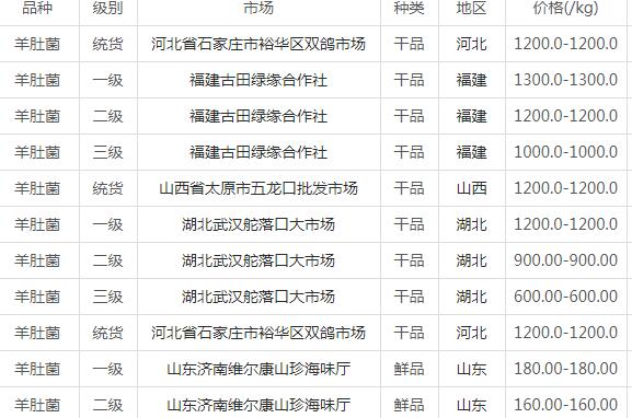 目前羊肚菌的市场价为每斤鲜品为80—120元,干品为每斤600—1200元,其中野生的羊肚菌最贵高达2500元每公斤(价格浮动以羊肚菌本身品质为定)。2019年最新价格如下(仅供参考):