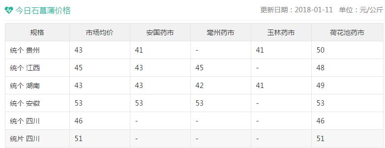 目前石菖蒲尚未有家种品,完全依赖野生资源的采集,在高价刺激下,各产区加大了采挖力度,今年7月份受新货不断冲击市场的影响,价格顺势回落,但到11月行情有止跌的现象。目前安徽市场价格为52-53元,估计,短期内行情以震荡上行为主。