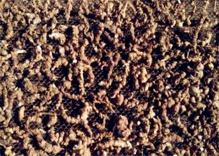 7、适时采收:苍术播后3~4年或移栽后2~3年即可采收,春季或秋季10~11月地上茎叶干枯后,择晴天挖取根茎,将挖取的根茎抖去泥土,除去残茎晒干或烘干后,撞去须根即可。