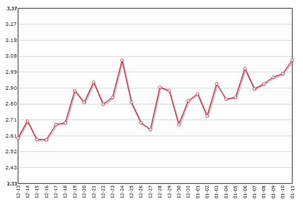 根据下图我们可以看出,2017年12月-2018年1月西红柿价格在2.6元/斤-3.06元/斤之间变动,并且呈现稳重有升的变化。