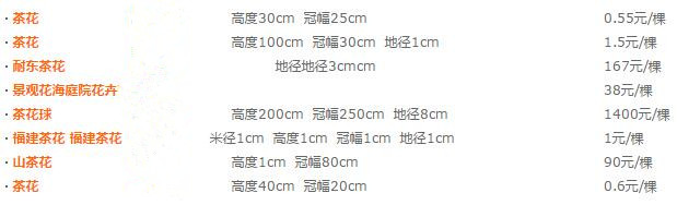 根据市场价格茶花高度在30公分的0.55元/棵;高度100公分的1.5元/棵;山茶花在1米的90元/棵,具体如下表: