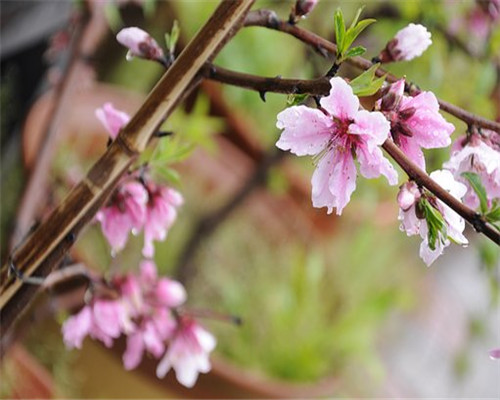 3、寿星桃:属矮化种,花小型、复瓣,白色或红色,枝条的节间极短,花芽密生。