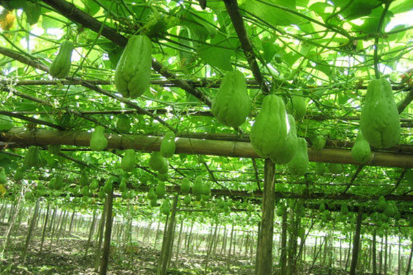 (2)及时搭架。佛手瓜攀缘性极强,而且每节均可萌发侧枝,因此要及时搭架。最好搭高2.5~3米的平棚架。