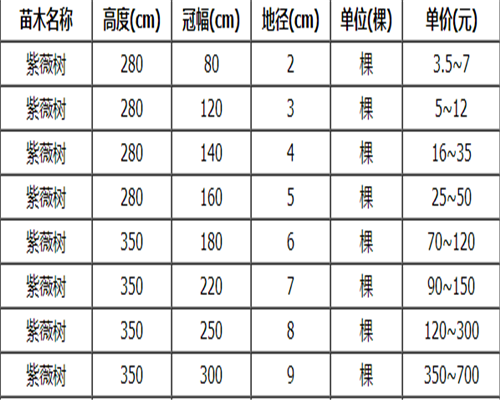 据长沙园林苗木批发市场杨先生介绍,紫薇树价格根据其高度、地径等的不同而变化,例如树高2.8米,冠幅0.8米,地径0.02米的紫薇树价格在3.5~7元之间,同等树高,冠幅1.2米,地径0.03的树价格在5~12元。下面表格中的价格仅供参考~