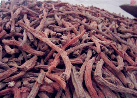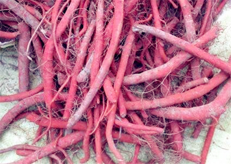 二、挖根繁殖秋末收获时,将生长健壮的丹参留在原地不挖,翌年3月再挖出根系分根繁殖。挖根时,选择直径1厘米、粗壮、色鲜红而无腐烂的1年生侧根,切成5-6厘米长的根段,按株行距20厘米X30厘米穴栽,栽后覆土面2厘米厚,稍压实。
