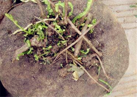 块根肥大,长圆形或不规则块状,外皮褐色。茎中空,有条纹,灰白色。叶互生,