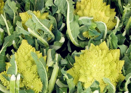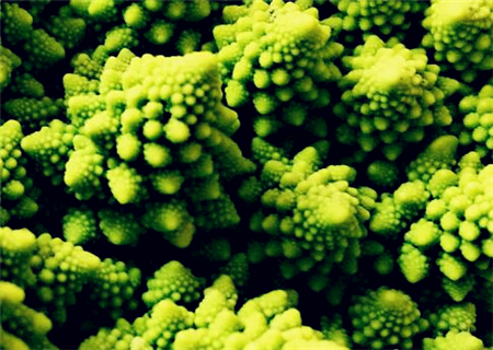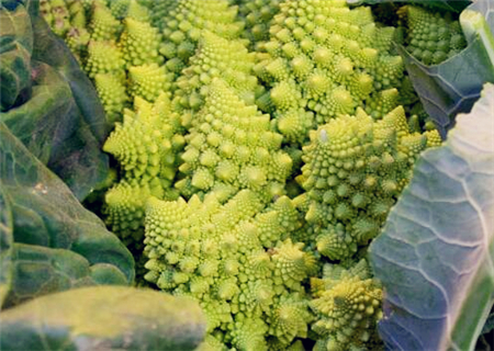 这种花椰菜的变种是最重要的不规则碎片形蔬菜。它的图案是斐波纳契数列,或称黄金螺旋型(一种对数螺旋,小花以花球中心为对称轴,螺旋排列)的天然代表。