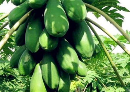 高温、光照足,使番木瓜果实生长、发育快[8u58药材网www.8u58.com],其中果实增重最快的时期是开花后62-82天;从开花至果实成熟所需天数,因开花时间不同而异,如4月上旬开花的,约经180天成熟;4月下旬开花的,约经160-170天成熟;6月上旬开花的,仅需用100-120天成熟;9月以后开花的,要180-210天才成熟。低温使果实发育期延长,且果肉有明显苦味,品质较差。