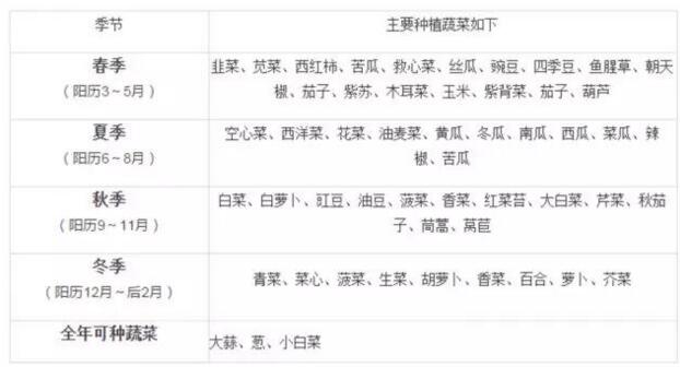 12月:甘蓝、油菜、韭菜、白菜、菠菜、芥蓝、生菜、葱、芫荽、芹菜、青花菜、豌豆、胡萝卜、大蒜、萝卜、花椰菜、茼蒿、茄子、番茄、辣椒。