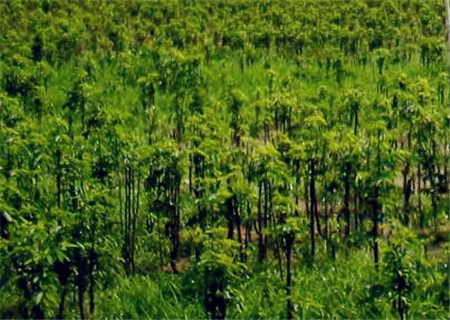 6.采收在温暖湿润的条件下,一般扦插50天-60天后,植株长至50厘米-70厘米高,长出嫩茎时即可采收。半年后,进入盛产期,一般每三天采收一次,每亩每次可采收40千克左右。采摘以在嫩茎尖的15厘米-20厘米处手折即断者为佳,可按市场要求捆成小把上市。嫩叶的采收全年都可进行,但苗木在当年的12月份至次年的2月份为休眠期,此期间不宜采收或少量采收。
