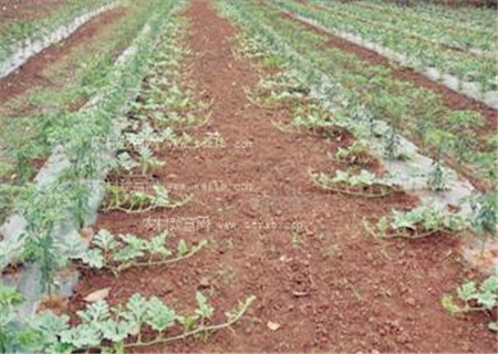 6.1.2追肥,西瓜是喜肥作物,合理施肥是保证西瓜优质高产的重要措施之一。总的原则是:慎施提苗肥,巧施伸蔓肥,重施膨瓜肥。追肥以速效肥为主。在施足底肥的情况下,非沙性土壤一般不施提苗肥,一般情况下主要进行两次追肥,伸蔓肥应以氮肥为主,辅以钾肥速效肥料,促进西瓜的营养生长,以保证西瓜丰产所需的发达根系和足够的叶面积的形成,一般每亩追尿素8公斤,硫酸钾5公斤。第二次是在果实膨大期之前追施速效化肥,追肥应以钾、氮肥为主,有利于果实产量的形成和品质的改善。一般每亩追尿素20-25公斤,硫酸钾10--15公斤。水肥管理应该根据当地的土壤气候条件、瓜秧长势合理控制,做到追控结合,灌排结合。
