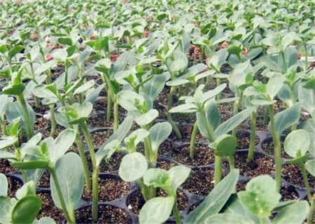 将已发芽一颗米长的种子平放在备好的营养杯的营养土上,芽向下(因芽是根),每个营养杯只放一粒发芽种子,上面再盖1厘米厚的营养土,淋少许1000倍托布津水(或其它杀菌剂)。插上竹块,盖上薄膜,薄膜四周用细泥压好。然后再插一层竹块,与第一层相隔15公分左右,再盖上一层薄膜,再将薄膜四周用细泥压好。这段时间棚内的温度要保持在22—28℃,待第一片真叶长出后,可逐渐降温。在出苗前几天,每天降1—2℃,最后与自然温度保持一致,以适应栽后的自然温度。