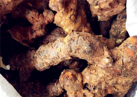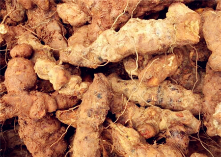 土茯苓的干燥根茎为不规则块状,略呈扁圆柱形而弯曲不直,多分歧,有结节状隆起,长约5~15厘米,直径约2~5厘米。表面土棕色或棕色,粗糙,常有刀伤切口及侧根残余部分,上端具茎痕。质坚硬,不易折断,断面粗糙,有粉性,淡棕色。气微,味甘淡。