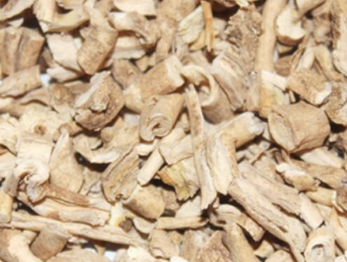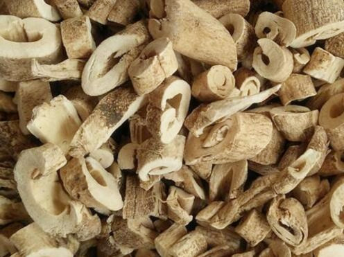 (1)采收:白鲜皮移栽后生长2~3年,在秋季植株地上部分枯萎后或翌春返青前采收药用根部,以秋季采收好。先割去地上茎叶,从苗床一端开始将根全部挖出,去掉泥土及残茎,放阳光下晾晒。晒至半干时除去须根,将根抽去中间硬芯(木质部),再晒至全干后入库备用。2.8~3.3公斤鲜根可晒干品1公斤,亩产干品300~350公斤。