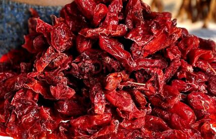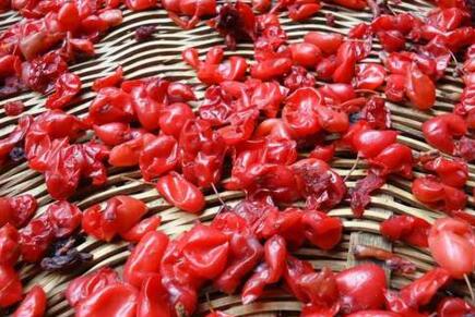 山茱萸商品不分等级,均为统货,要求干货,果肉呈不规则的片状或囊状。表面鲜红、紫红至暗红色,皱缩,有光泽。味酸涩。果核不超过3%,无杂质,无虫蛀,无霉变。