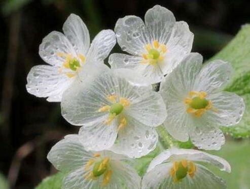 当它的花瓣遇水的时候,花瓣会变得透明起来。能看到花瓣上的纹路,所以被称为skeletonflower(骨架花)。山荷叶花语是亲情。