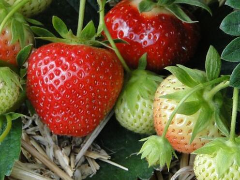 3.灌排方法:在开花与浆果生长初期,分别灌水1次。宜用沟灌,使水灌到沟高2/3处为好,让水渐渐渗入畦土,沟内余水排出。若天旱,应5-7天灌水1次。用橡胶管前端套上一段金属管进行穴灌,既省水,又能保持畦土疏松。秋季多雨时,应及时排水。草莓园四周应早做排水沟道,使棚内畦沟水能排尽。