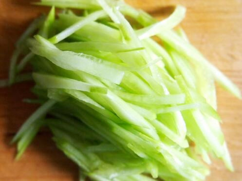 1、选不糠不烂的大个鲜苤蓝,冲洗干净后,切成3×3毫米见方的长丝。
