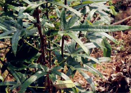 (3)、中耕除草:五指毛桃定植初期会有很多杂草萌发生长,不仅消耗土壤水分,影响封升温,还将推迟生长周期。当杂草长出3—5片叶子时,每亩可用5﹪闲锄乳油40毫升对水30升喷洒,如果每20亳加1支增效剂特效王2毫升,可提高杀草效率40﹪。此外用农达或者6﹪克草星乳油效果也很好。当五指毛桃长高后,由于枝叶繁茂,会遮挡住杂草,从而天然抑制了杂草的生长。