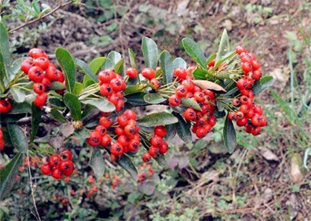 火棘果实10月成熟,可在树上宿存到次年2月,采收种子以10~12月为宜,采收后及时除去果肉,将种子冲洗干净,晒干备用。火棘以秋播为好,播种前可用万分之二浓度的赤霉素处理种子,在整理好的苗床上按行距20~30厘米,开深5厘米的长沟,撒播沟中,覆土3厘米。