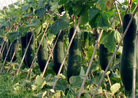 2、搭架引蔓:当瓜蔓长至30厘米左右时,可插竹搭架引蔓,搭架高度1.5米为宜,上加一条较粗的横梁连贯固定支架,引蔓时根据畦的方向,定向把蔓引向横梁,可有利结瓜后瓜叶能遮挡太阳斜照而防止灼伤瓜实。
