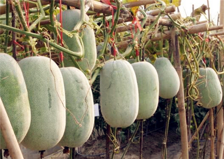 授粉。冬瓜生长培育部位要求选择在主蔓28节间前后、并选择瓜形均匀,瓜蒂较短且无病虫为害的幼瓜,才能培植出硕大的瓜果。幼瓜选定后,应把再长出的雌花摘除。当幼瓜长至2-3公斤时,可用麻绳结网将瓜吊于横梁上生长。留瓜后,蔓苗再伸长到10节后将顶部摘除,以集中养分供应瓜实。