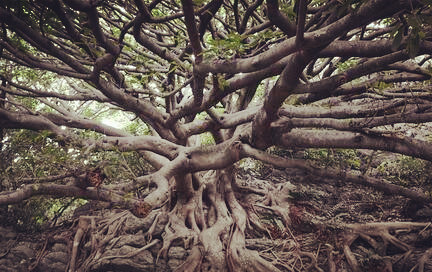 我们的船渐渐逼近榕树了。我有机会看清它的真面目,真是一株大树,枝干的数目不可计数。枝上又生根,有许多根直垂到地上,伸进泥土里。一部分树枝垂到水面,从远处看,就像一株大树卧在水面上。